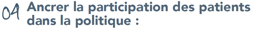 Impliquez de manière structurelle les patients, les aidants et les professionnels de santé dans les conseils consultatifs et les instances politiques. Recueillez activement leur expertise vécue et encouragez la coconstruction des politiques avec tous les acteurs concernés.